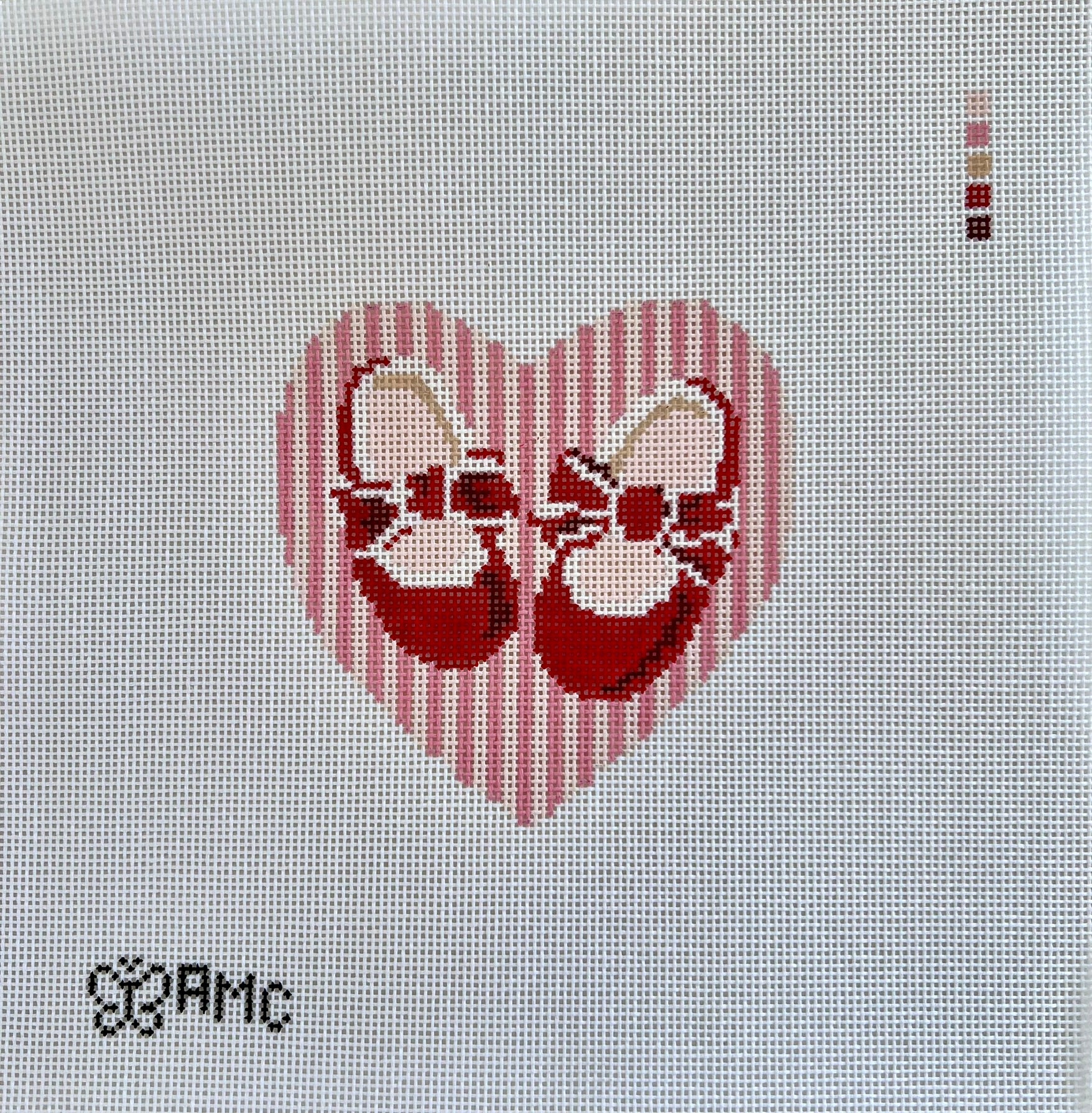 Sweet Red Bow Mary Janes with a striped heart-shaped background. The Red Bow Shoes on Striped Heart is a beautiful 4" x 3.75” design hand-painted on 18 mesh, with a total canvas size of approximately 8" x 8".