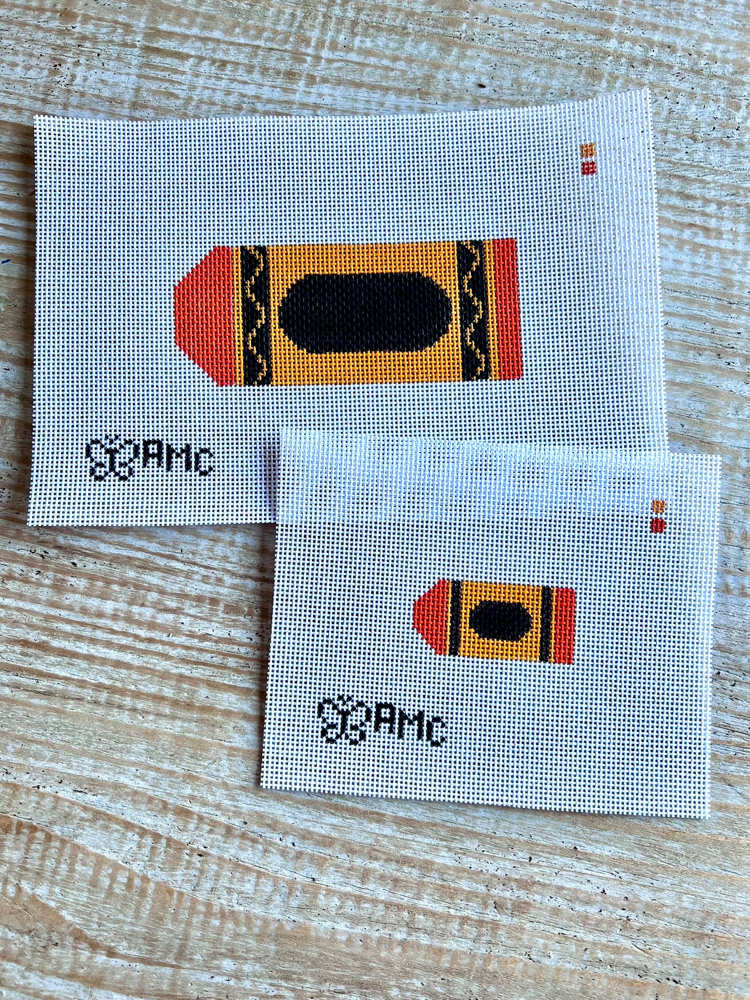 The Mini Crayon is a 2.5" X 1.25" design hand-painted on 13 mesh, with a total canvas size of approximately 7" X 6". You can personalize it with a letter, and it's a great gift idea for a teacher. It can be finished into a bag charm, a scissor fob, or a small ornament. This canvas is available in 7 beautiful colorways: Pink, Red, Orange, Yellow, Green, Blue & Purple.